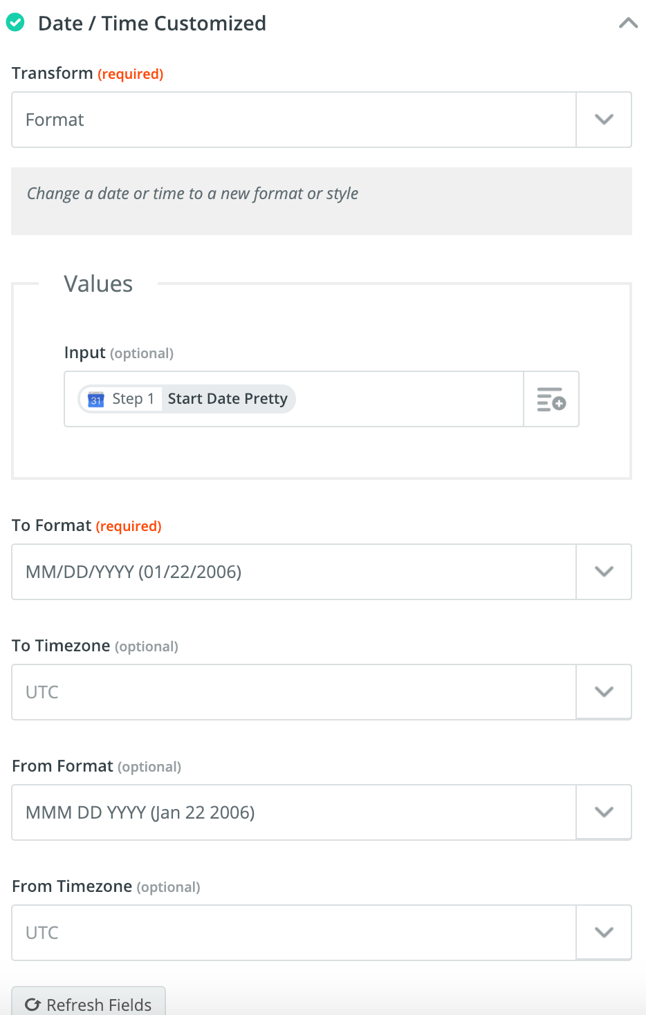 If required, the date/time format can be changed in your Zap by adding a Formatter action to your Zap. For further reference, see the Formatter chapter.