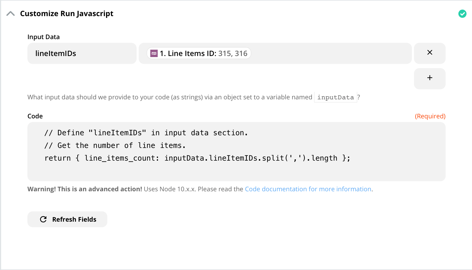 lineItemIDsby choosing the 1. Line Items ID in the Input Data section. - Copy the code snippet below and paste it into the Code section.