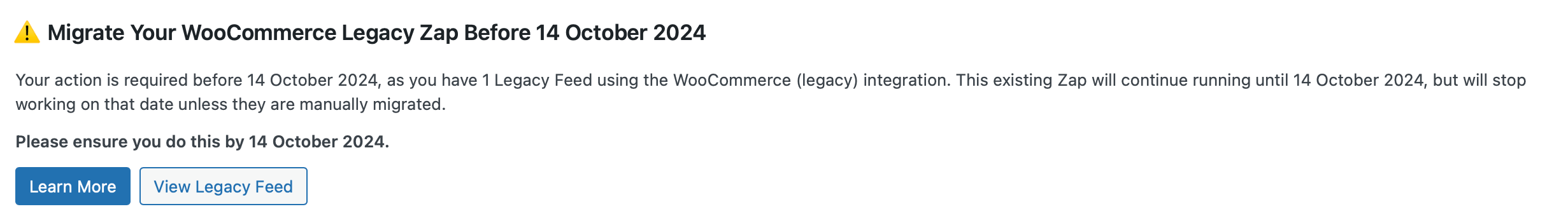 Existing users will see that their existing Zaps now use a WooCommerce (legacy) app. These existing Zaps will work until 14 October 2024. However, if you edit an existing Zap, it will need to be migrated to the new WooCommerce app.