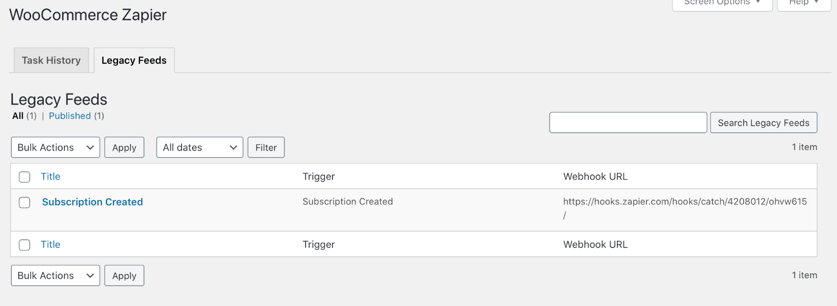 Location: WordPress DashboardSide MenuWooCommerceZapier screen → Legacy Feeds tab.