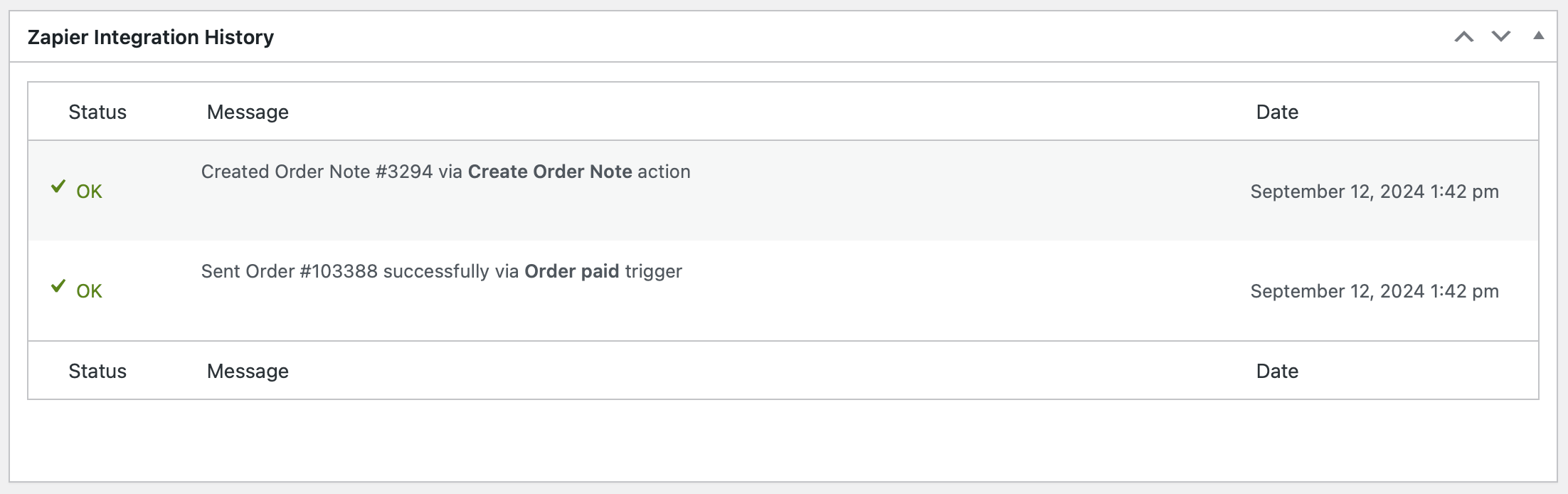 Every supported Resource screen (except for Customer) has a Zapier Integration History metabox, located at the bottom of the screen when viewing/editing the Resource.