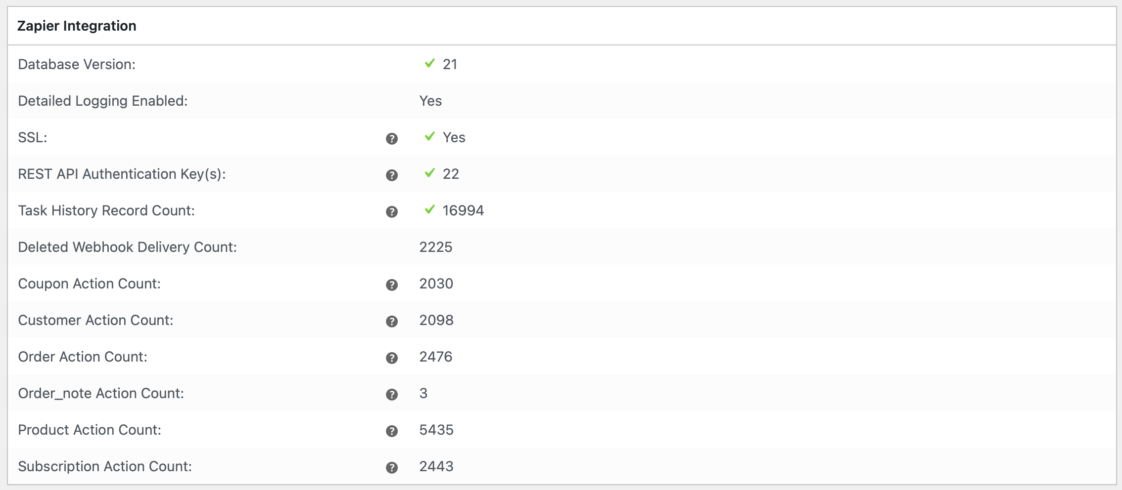 You can keep track of the overall status of the Zapier integration by going to the WordPress DashboardSide MenuWooCommerceStatus screen and then scrolling to the Zapier Integration section towards the bottom of the screen. You can see a detailed explanation of each row if you hover over the icon with your pointer.