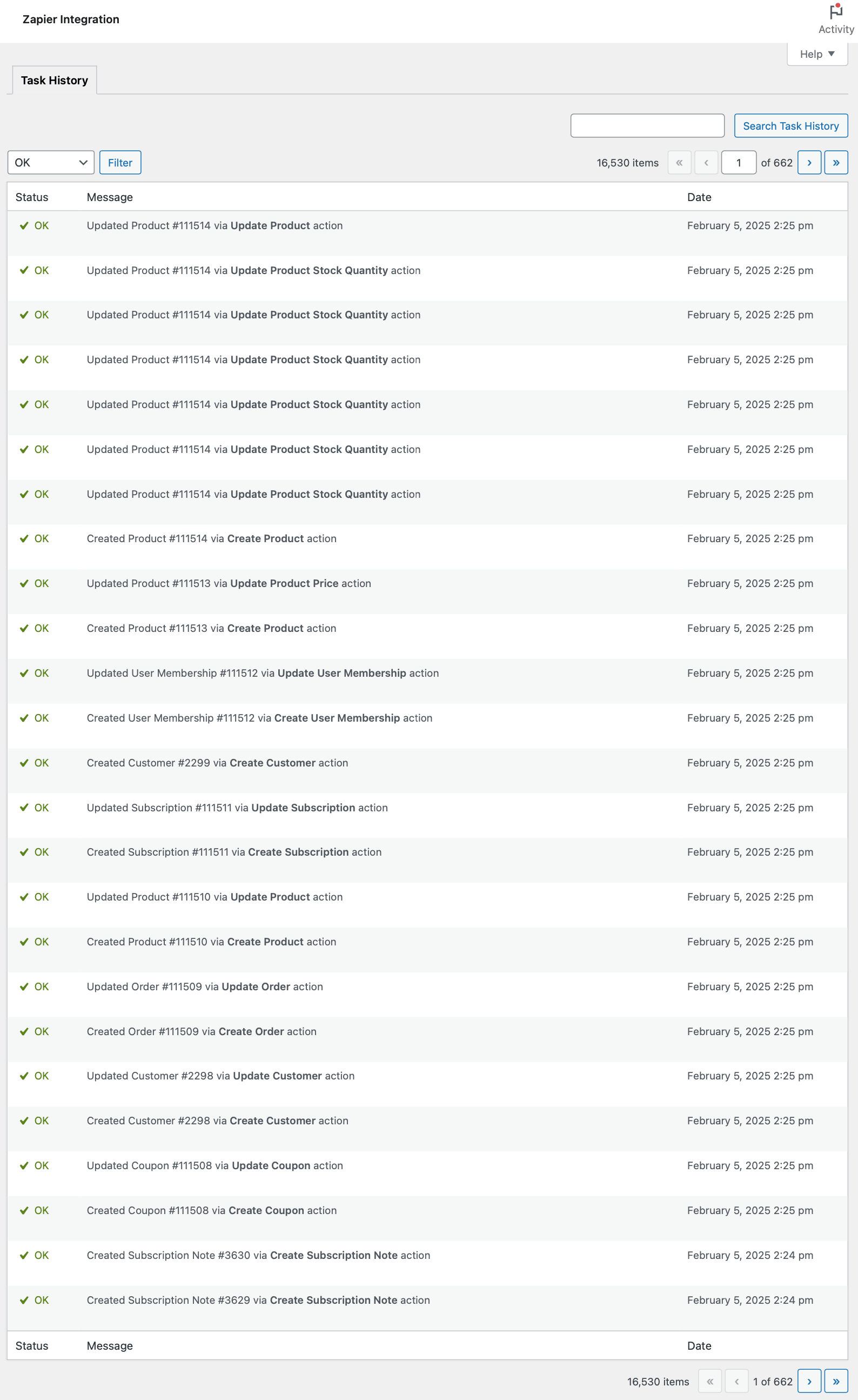 This is the main place to see every incoming and outgoing task/request for Zapier Integration for WooCommerce.