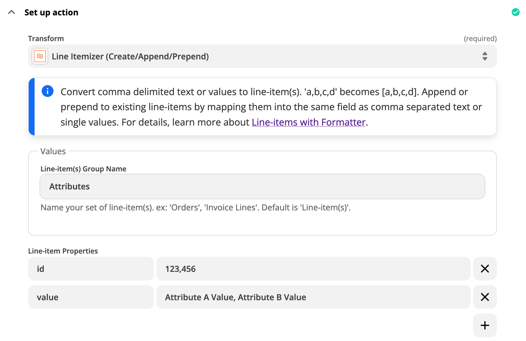 The Line Itemizer transform in the Formatter by Zapier app allows you to easily convert comma-separated text or values into line items that can be used in Zapier Integration for WooCommerce Actions.
