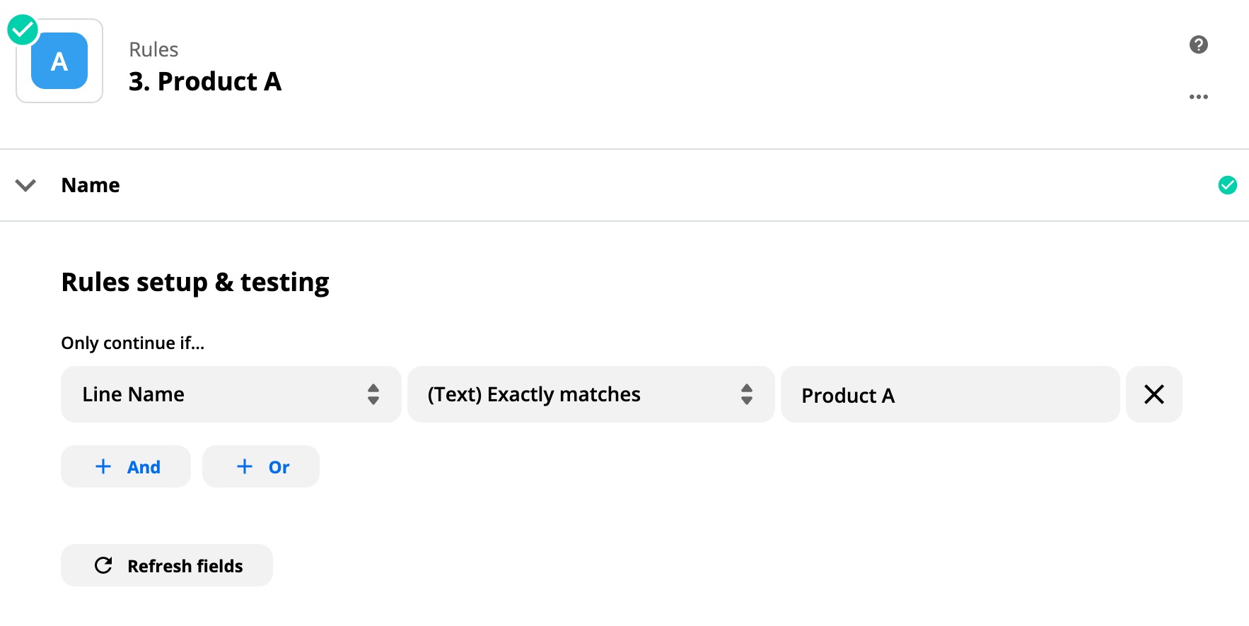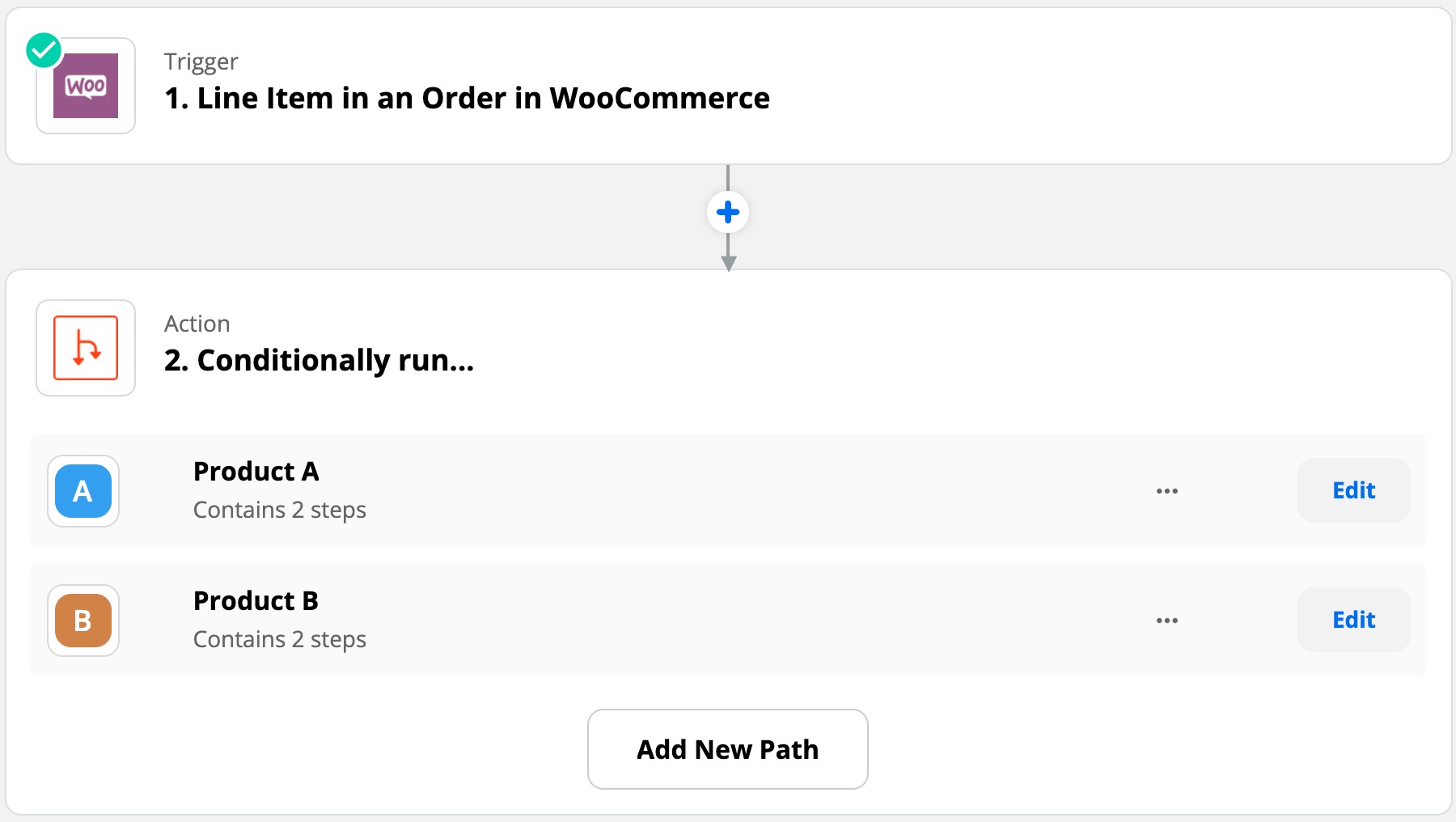 For example, using a Paths by Zapier step, you can set up several paths for different products in your store, which would look something like this: