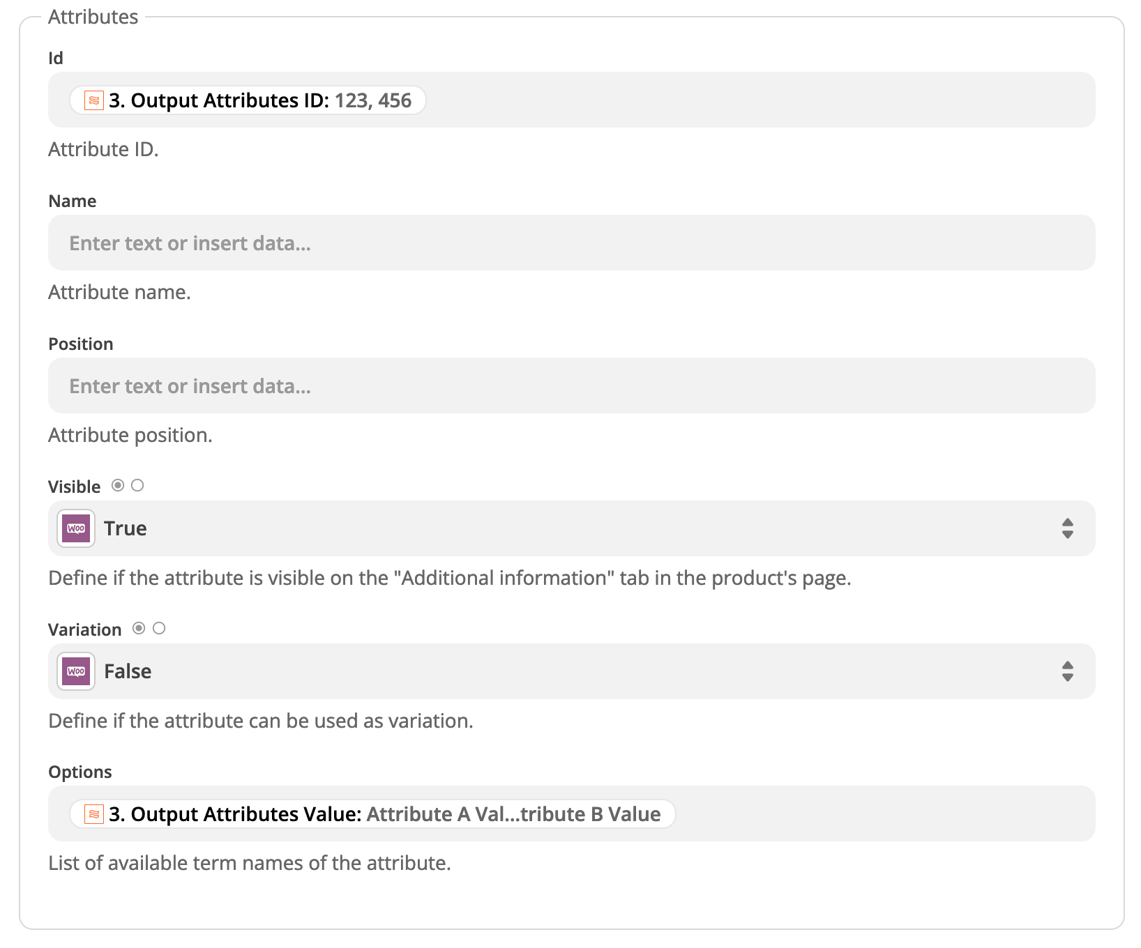 Repeat the above process for all attributes that you would like to use in your Zap.